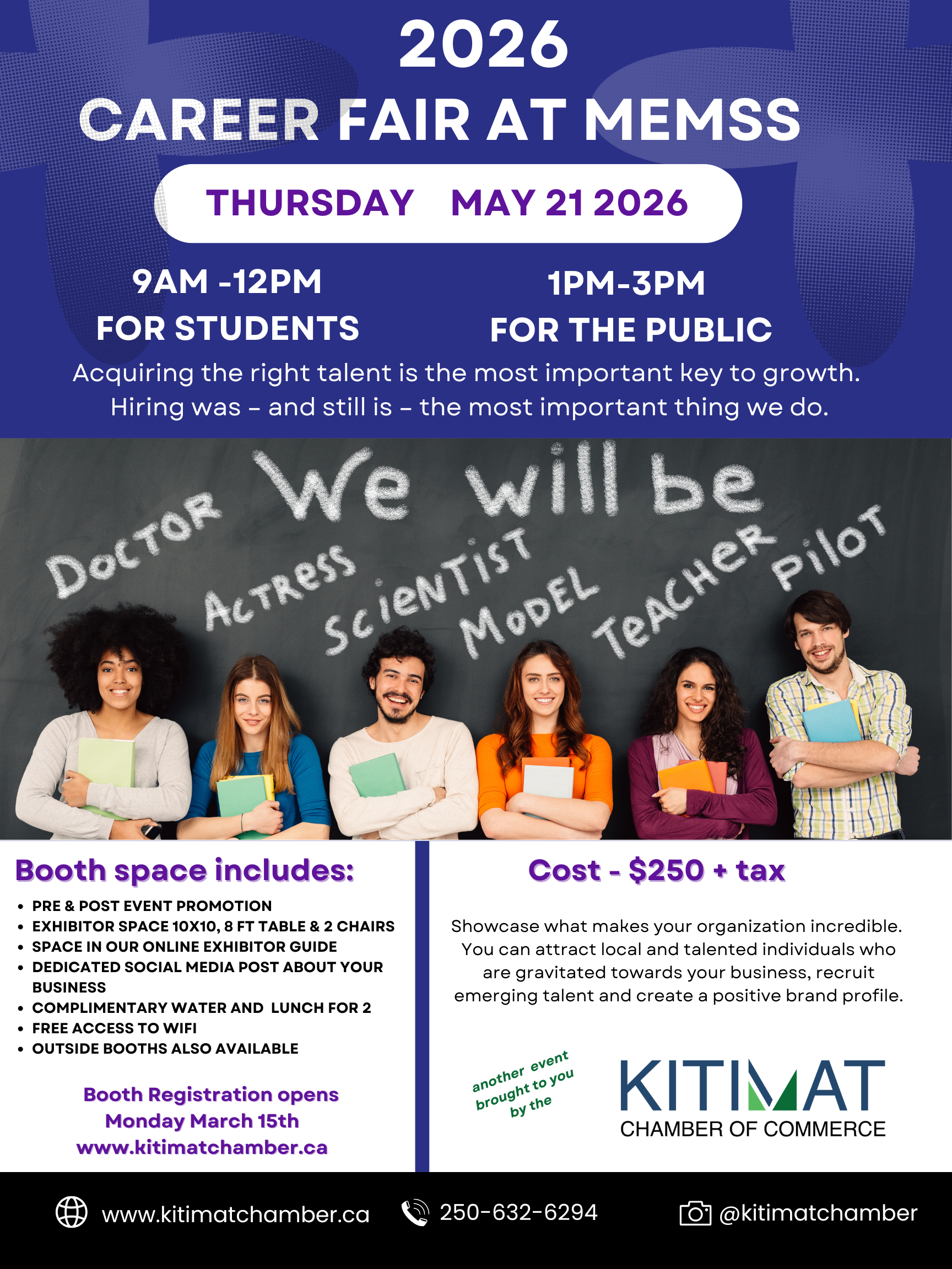 The Kitimat Chamber of Commerce invites local businesses and organizations to participate in our upcoming Career Fair. This is your opportunity to showcase what makes your organization incredible while connecting with students and local job seekers exploring future career paths.